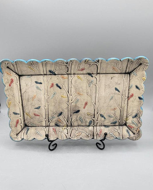 11.75X7 inch Hand Painted X-Large Platter with Embossed Multi Color BIRDS IN FOREST