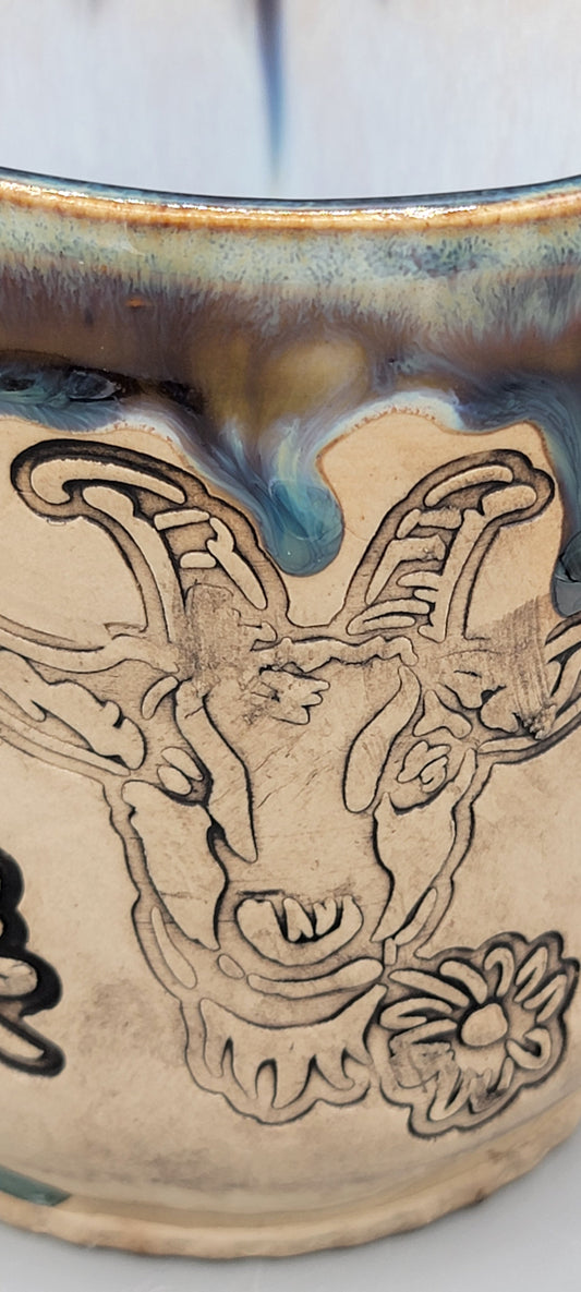 14-15oz Embossed BMFS Happy Goat Ceramic Mug in Floating Blue With Music Notes on Inside