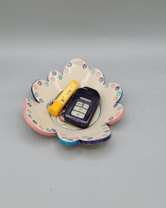 7 inch Hand Painted Flower Peace Flowered Shaped Circle Trinket Bowl in Cotton Candy Skies