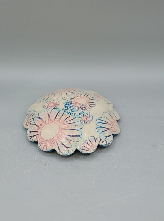 5 inch Hand Painted Embossed Daises Scalloped Circle Trinket Dish in Cotton Candy