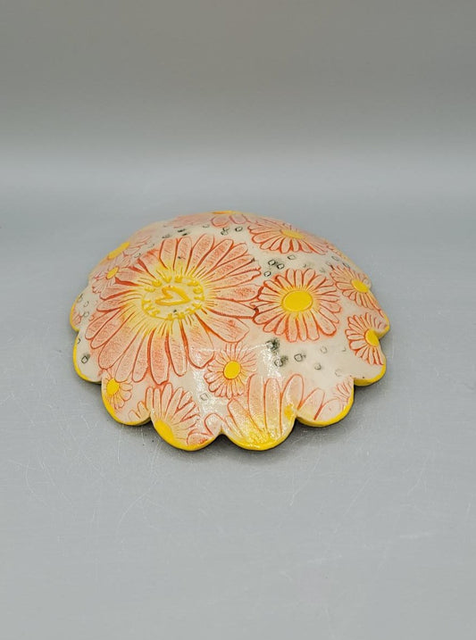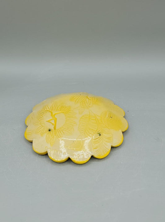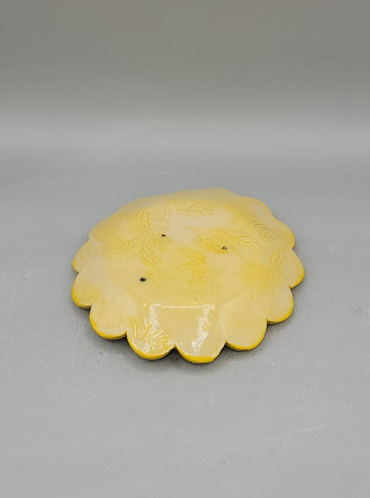 6 inch Hand Painted Embossed Daises Scalloped Circle Trinket Dish in Sun Shine