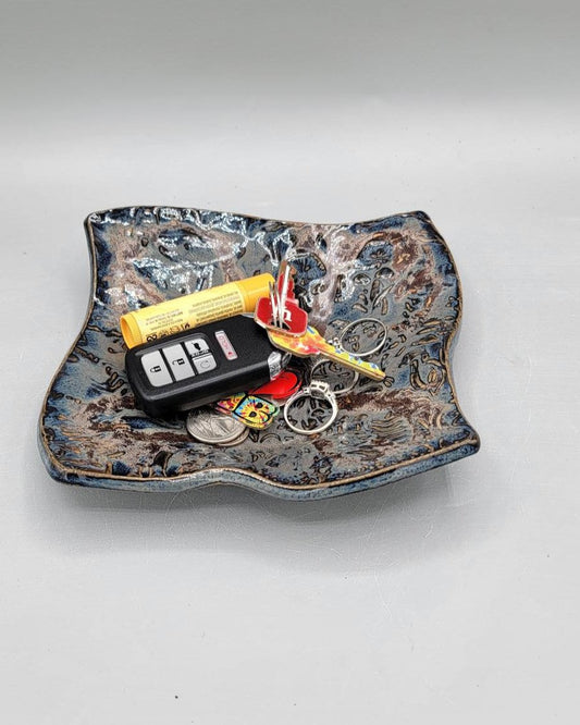 4 inch Embossed Mushrooms Fancy Square Trinket Dish in Midnight Blue